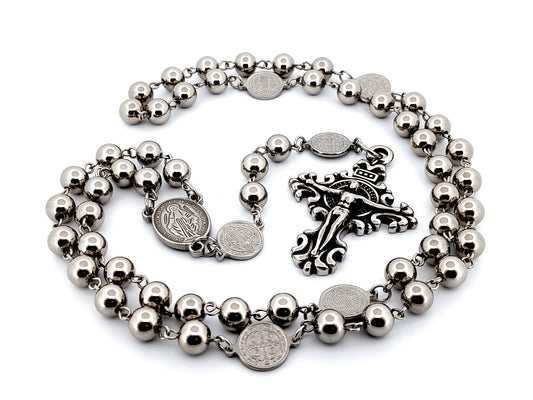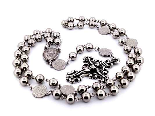 Miraculous medal stainless steel large rosary beads with Saint Benedict medals and scroll crucifix.