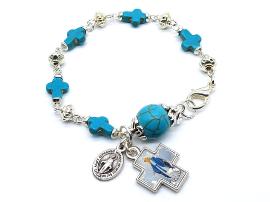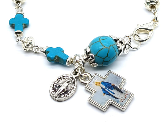 Miraculous Medal stainless steel and 925 sterling silver 5 decade rosary bracelet with small Saint Benedict crucifix.