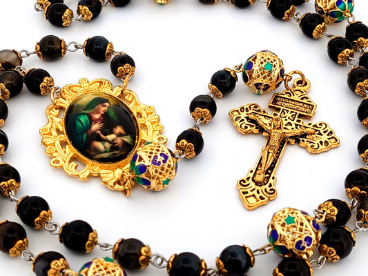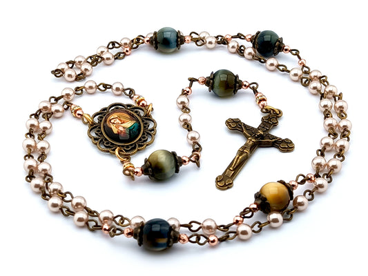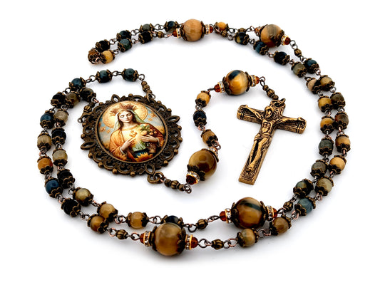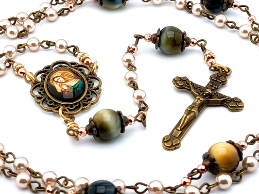 Virgin Mary tigers eye gemstone rosary beads with floral glass beads and Holy Spirit crucifix.