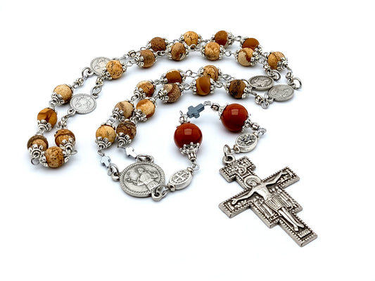 Our Lady Queen of Heaven jasper gemstone wearable rosary with stainless steel Saint Benedict crucifix.
