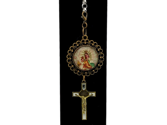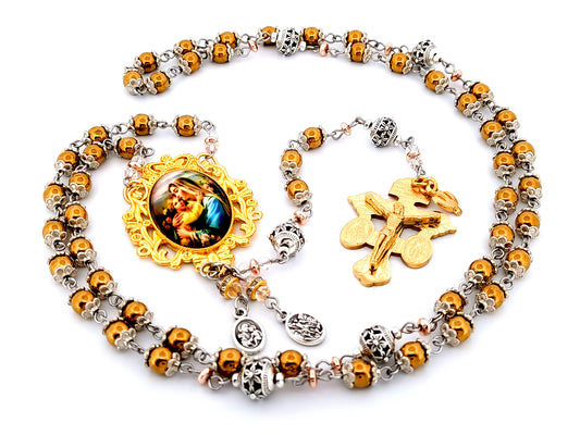 Our Lady of Perpetual Help rose gold hematite gemstone and 18K gold plated cubic zirconia rosary beads with white enamel and gold Saint Benedict crucifix.
