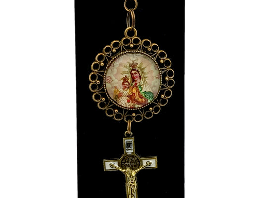Our Lady at prayer gold plated stainless steel and 18K gold plated cubic zirconia rosary beads with gold plated Saint Benedict crucifix.