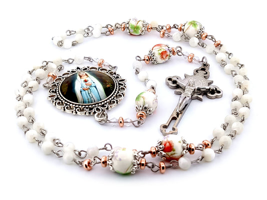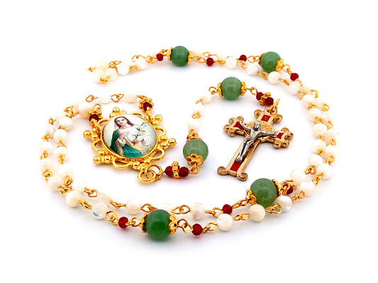 Our Lady Queen of Angels pearl and gemstone rosary beads with stainless steel crucifix.