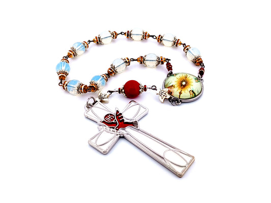 Saint Mary Magdalene howlite gemstone and glass prayer chaplet with Holy Spirit centre medal.