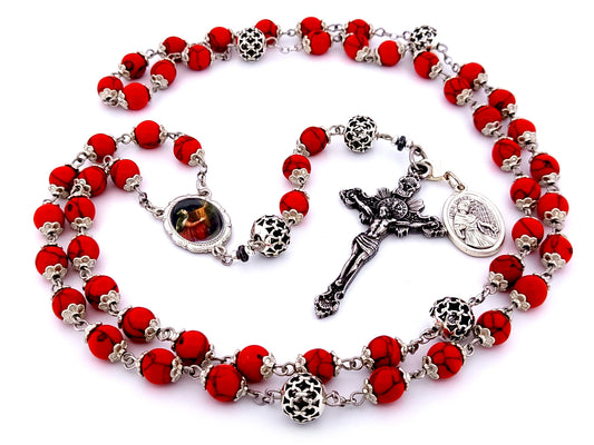 Virgin Mary millefiori glass and silver rosary beads with red enamel crucifix.