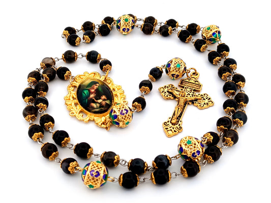 Our Lady of Perpetual Help blue and copper hematite gemstone rosary beads with gold plated Trinity crucifix.