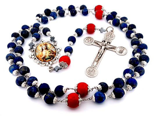 Saint Monica blue jasper and lapis lazuli gemstone rosary beads with bronze filigree crucifix.