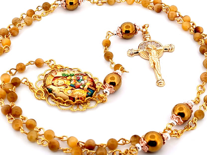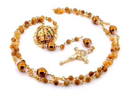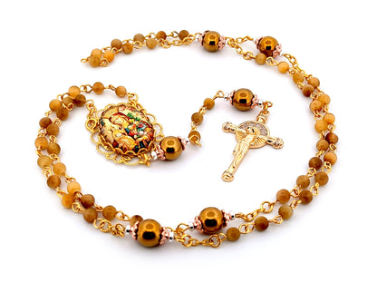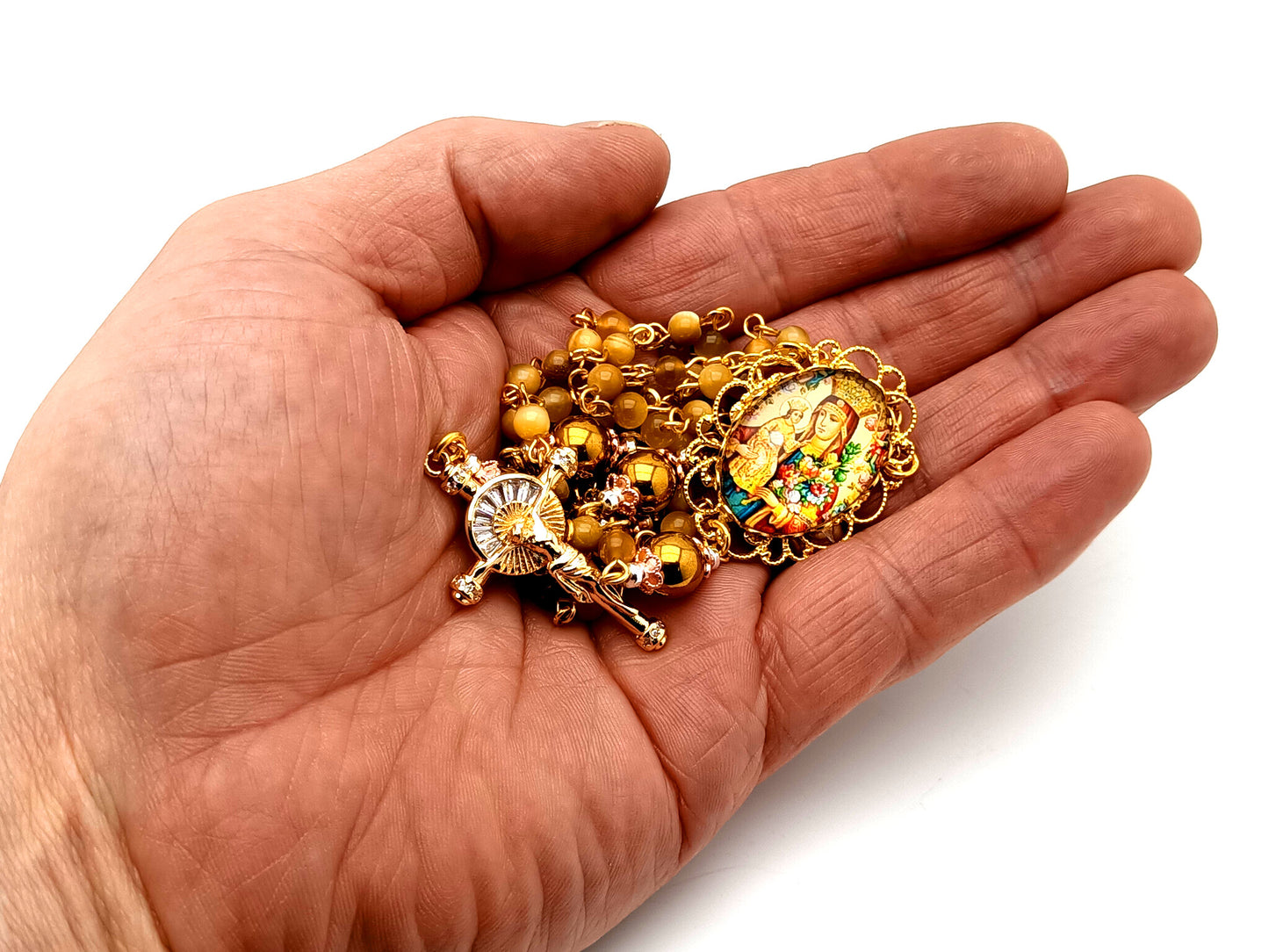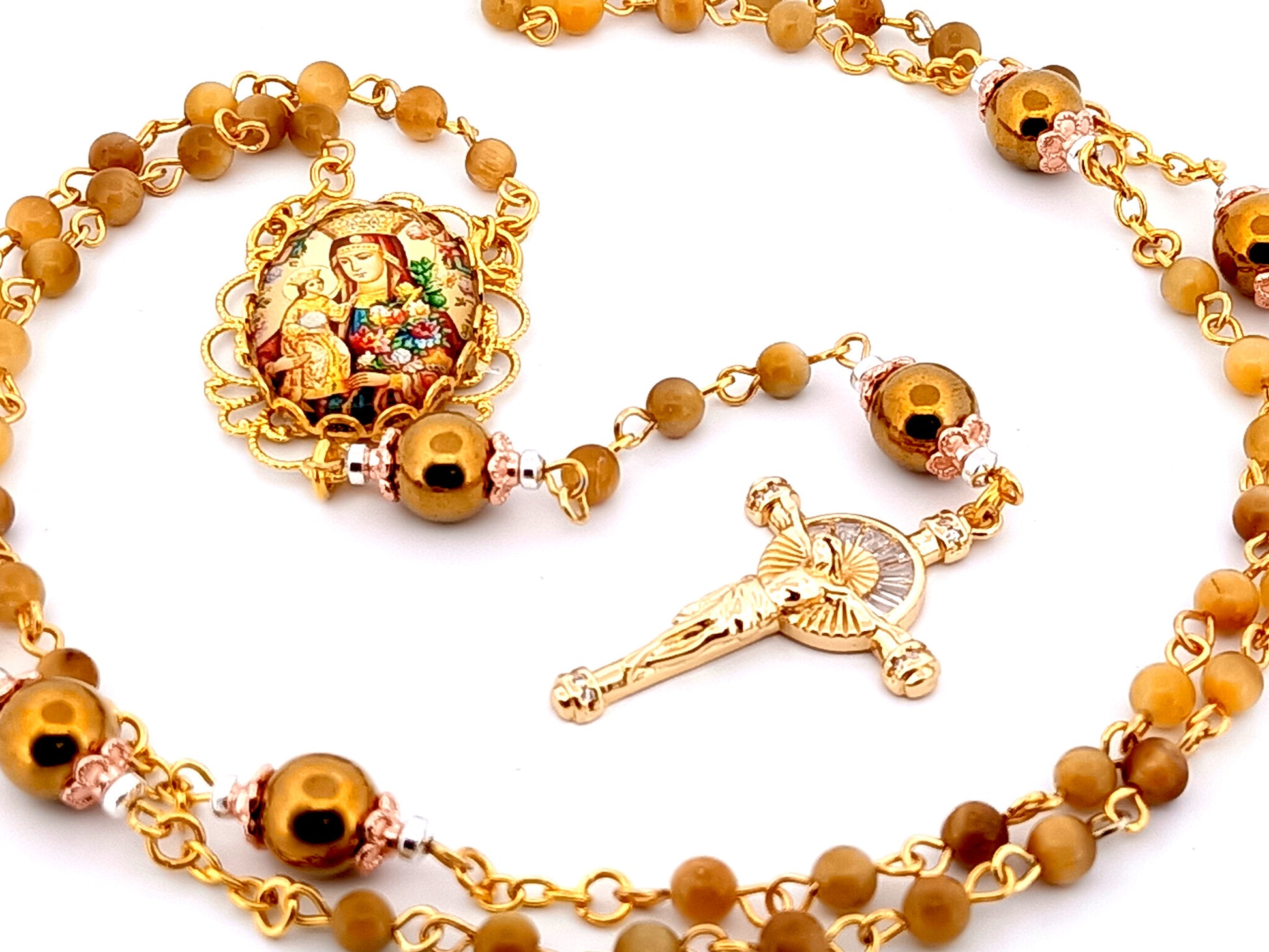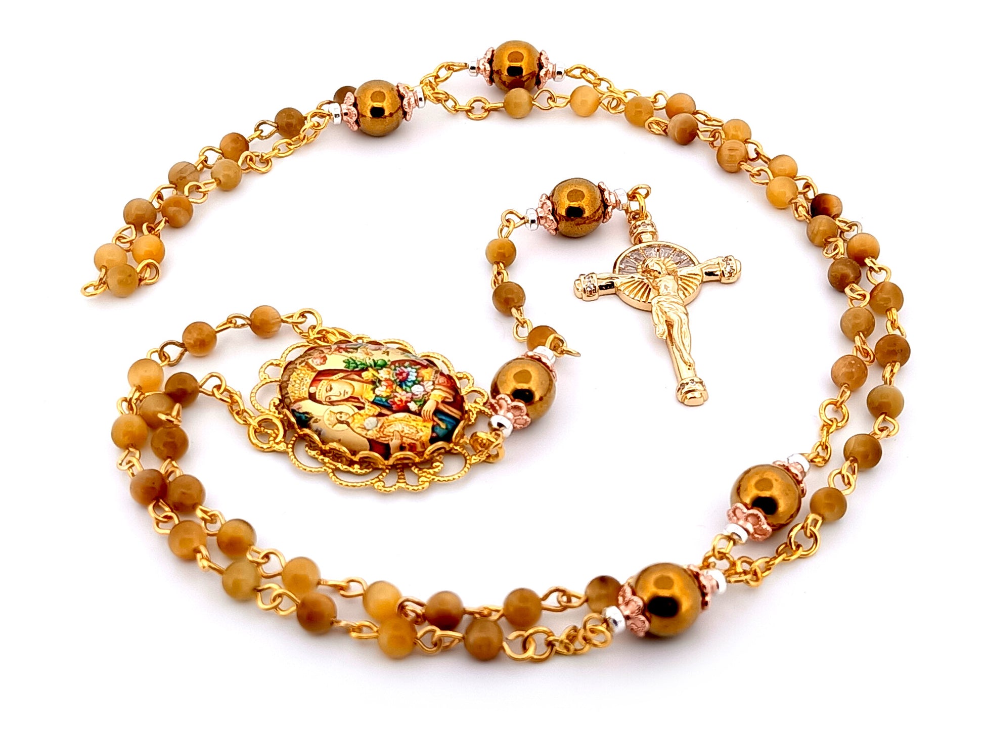 Our Lady of Perpetual Succor tigers eye gemstone rosary beads with sunburst crystal crucifix.