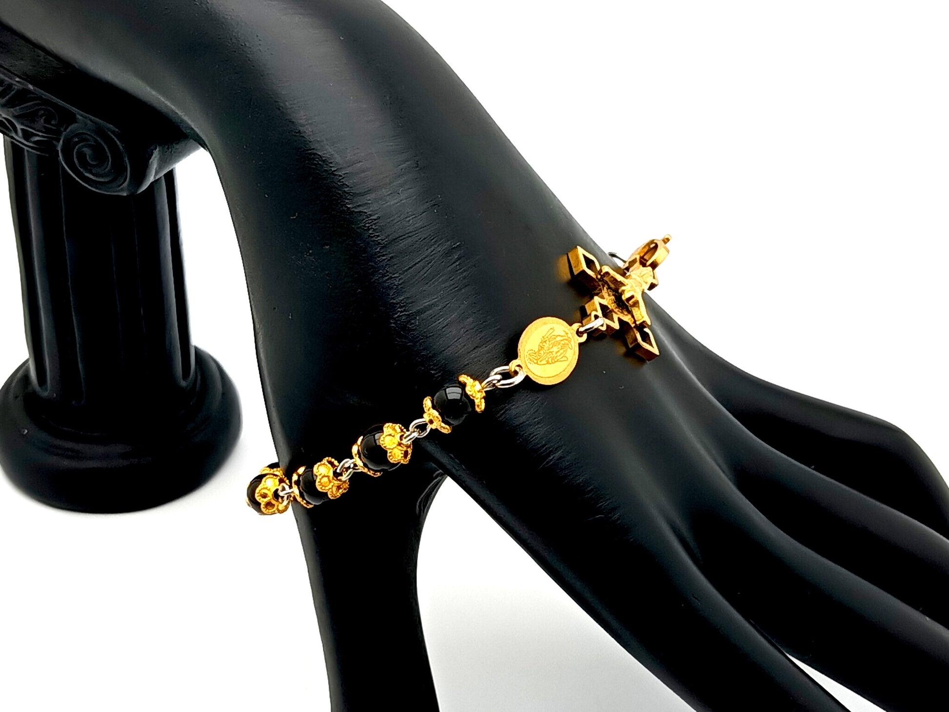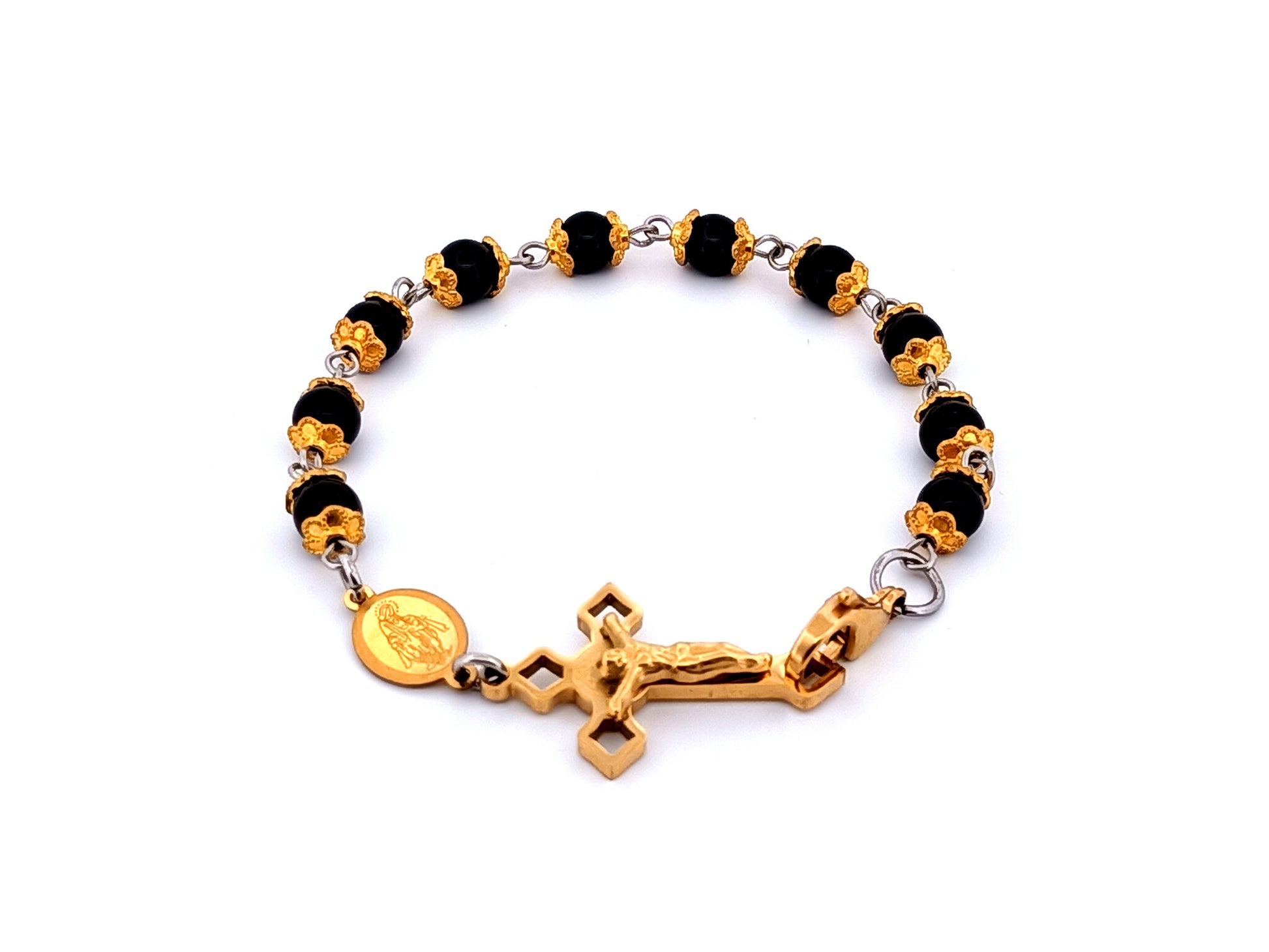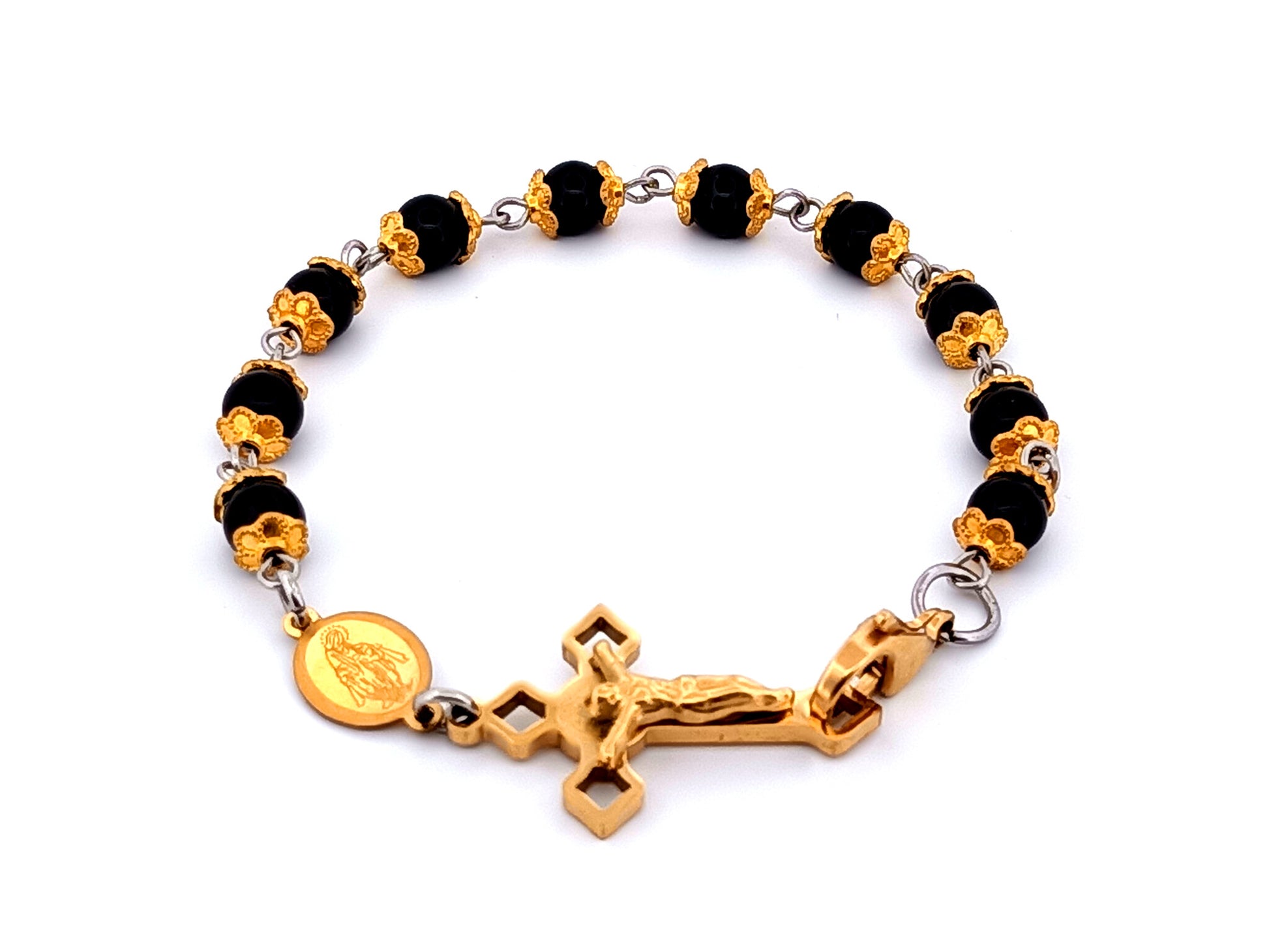 Miraculous medal onyx gemstone single decade rosary bracelet with Saint Benedict linking crucifix.