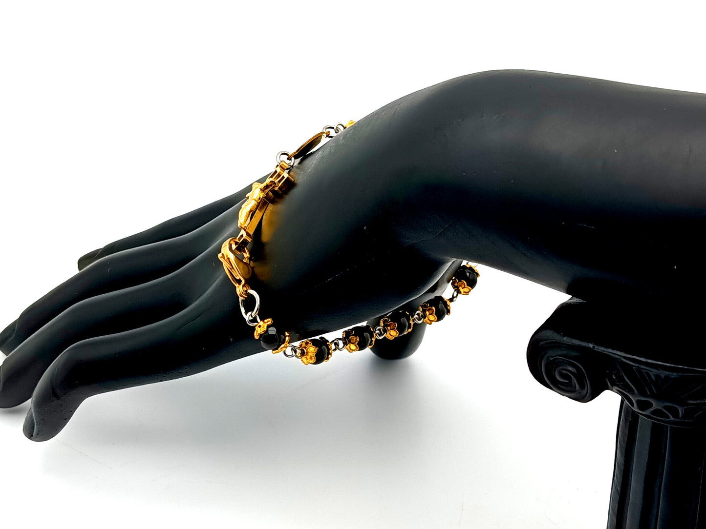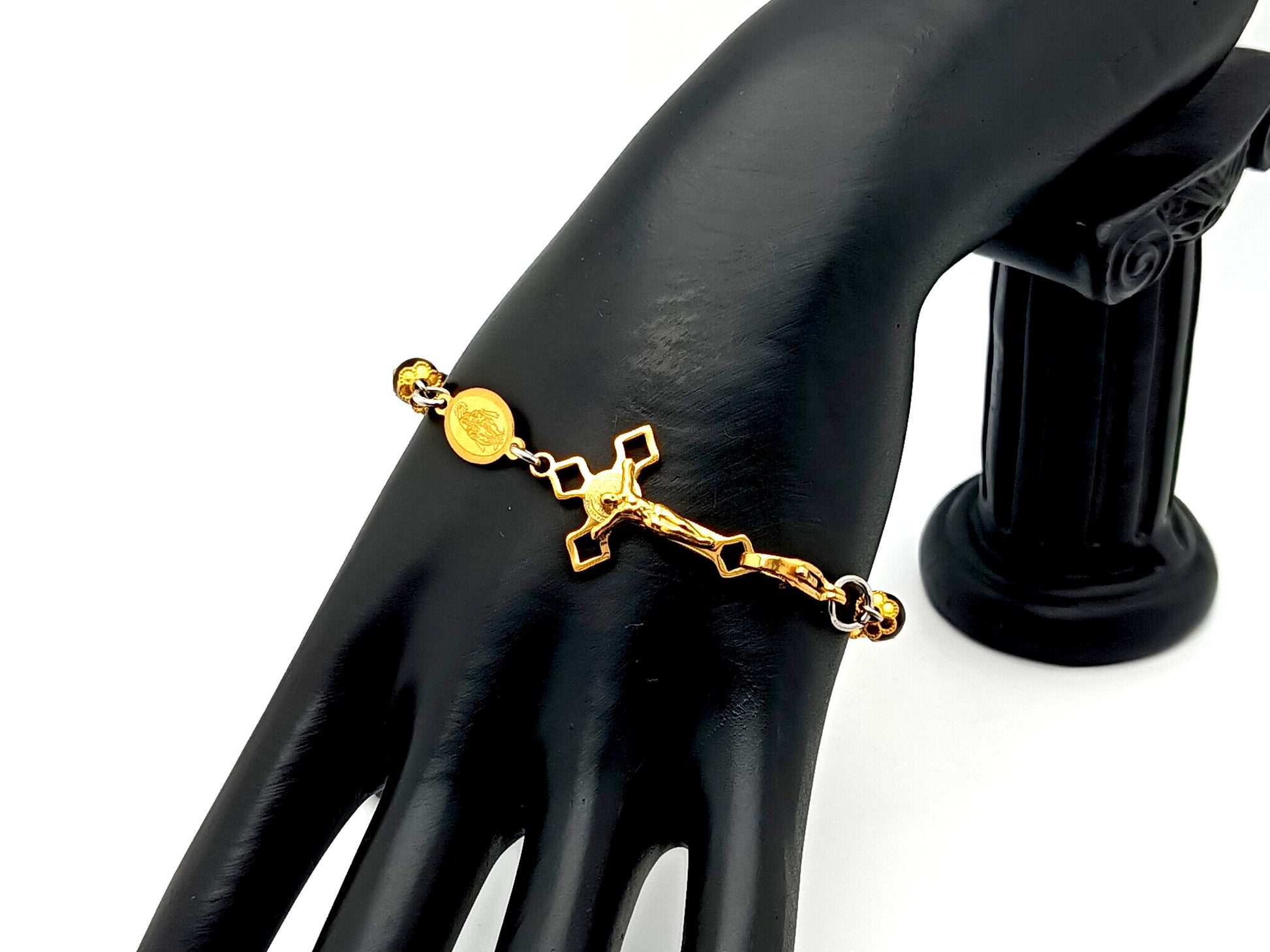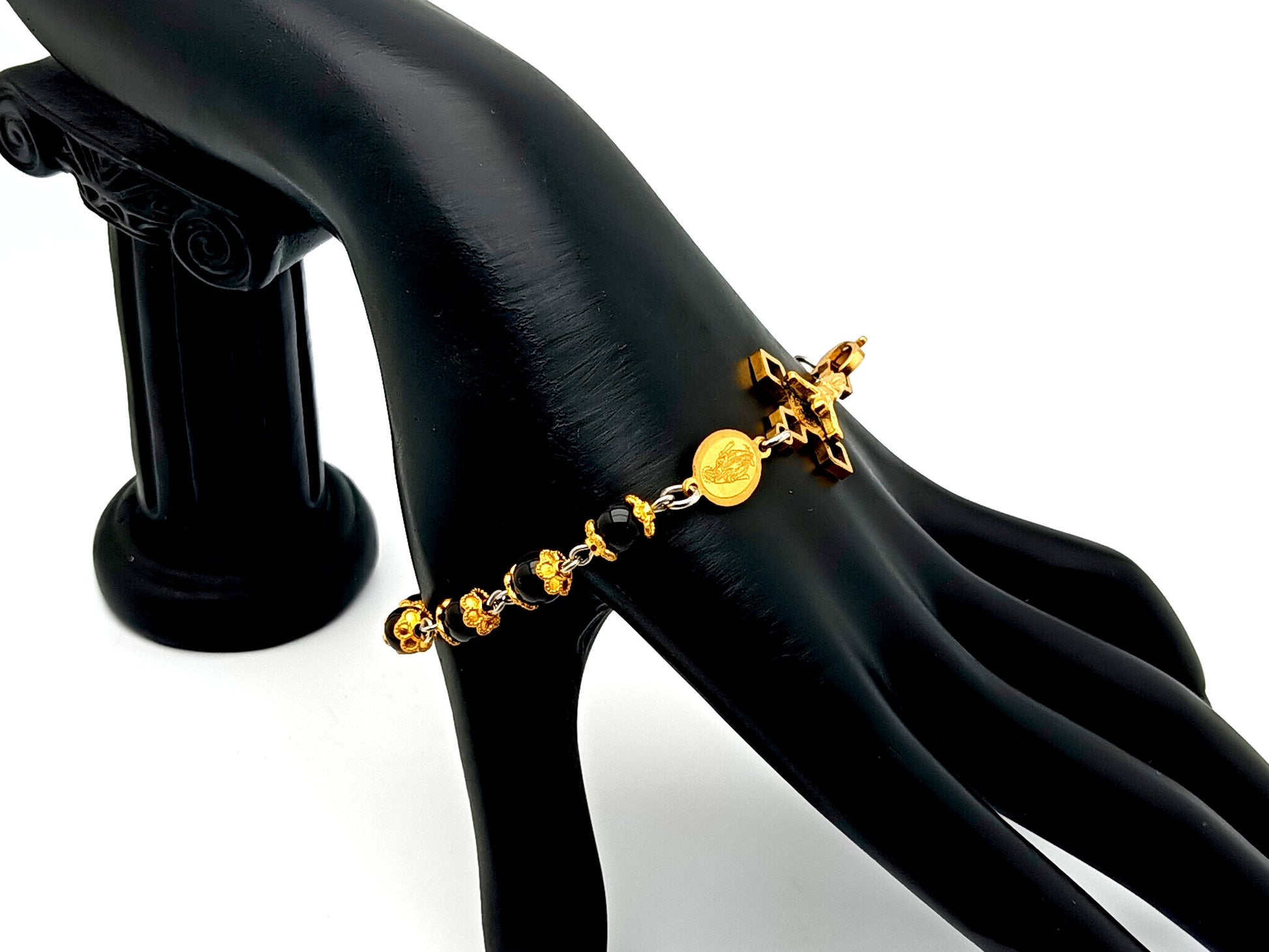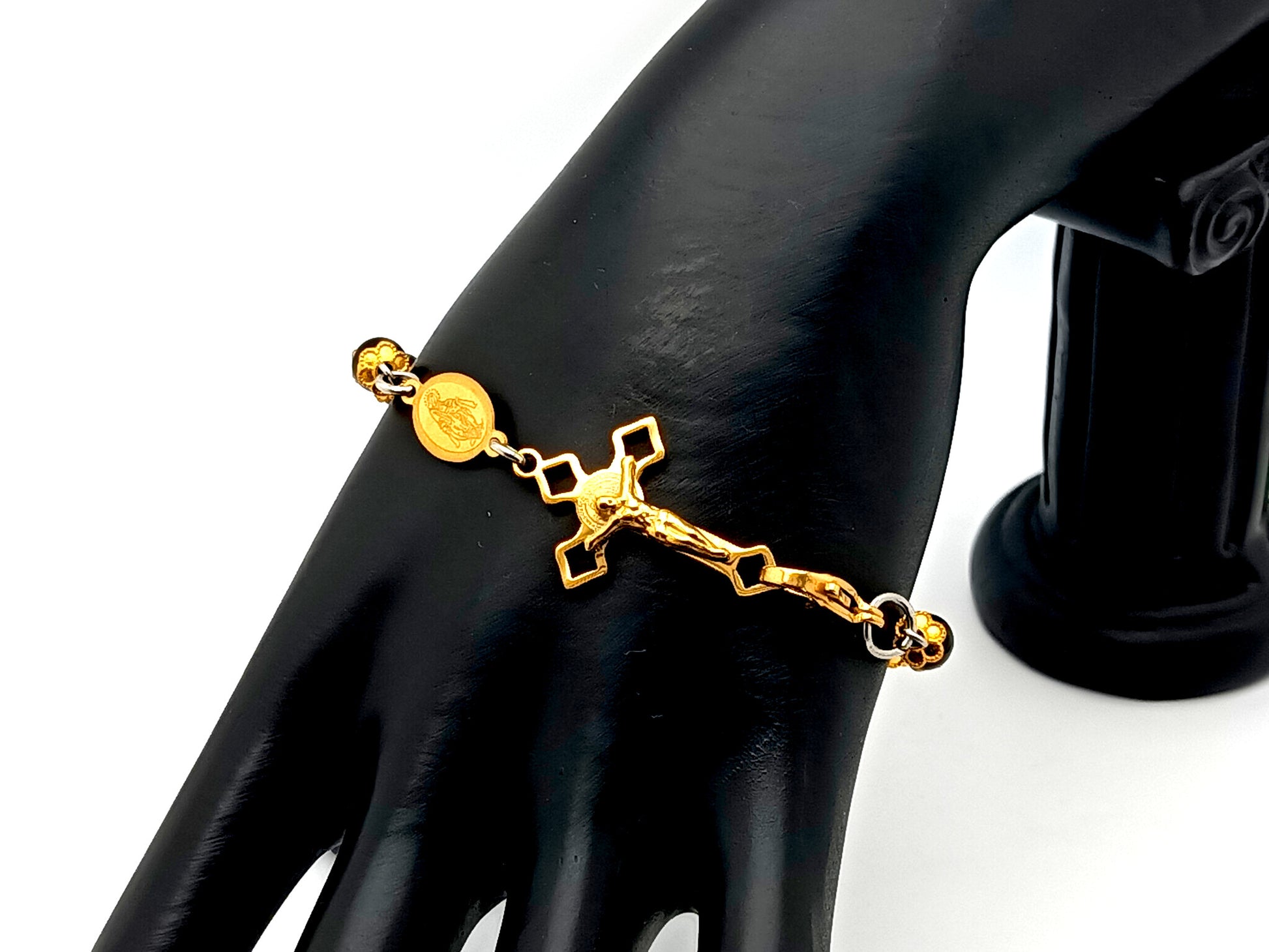 Miraculous medal onyx gemstone single decade rosary bracelet with Saint Benedict linking crucifix.