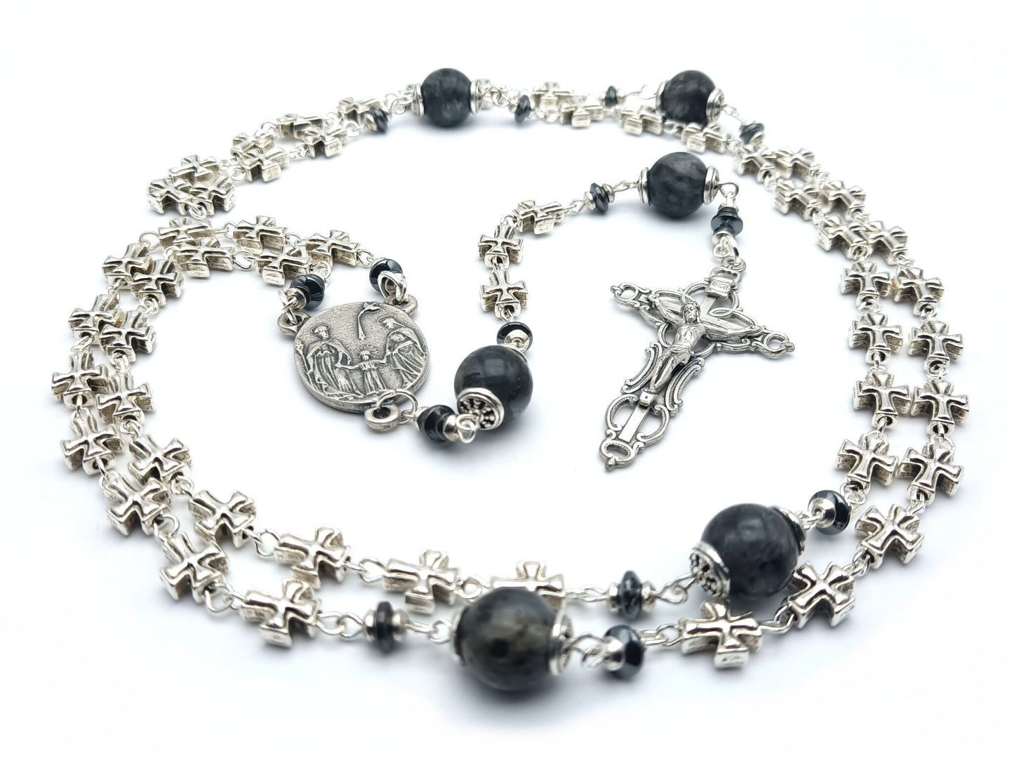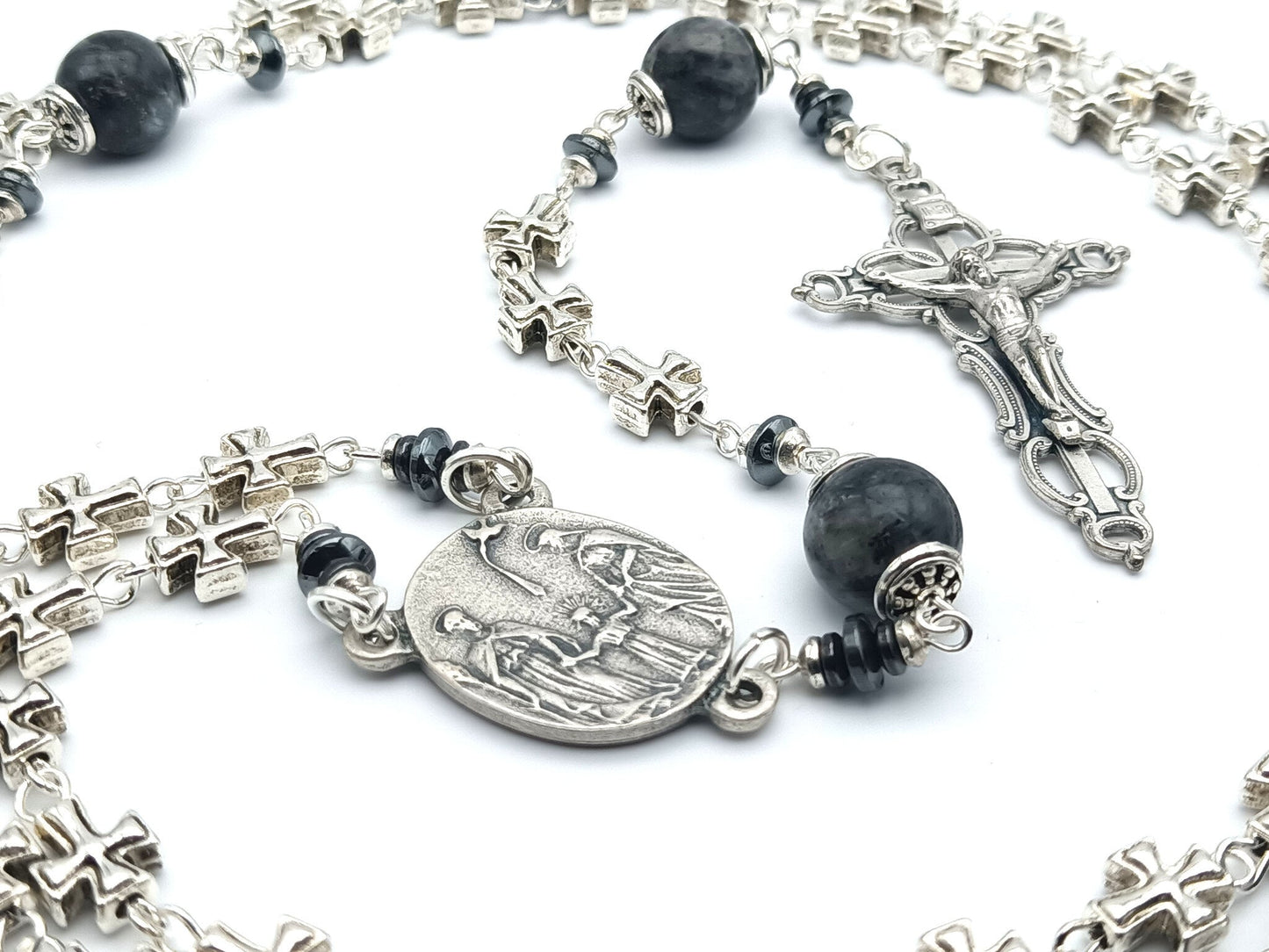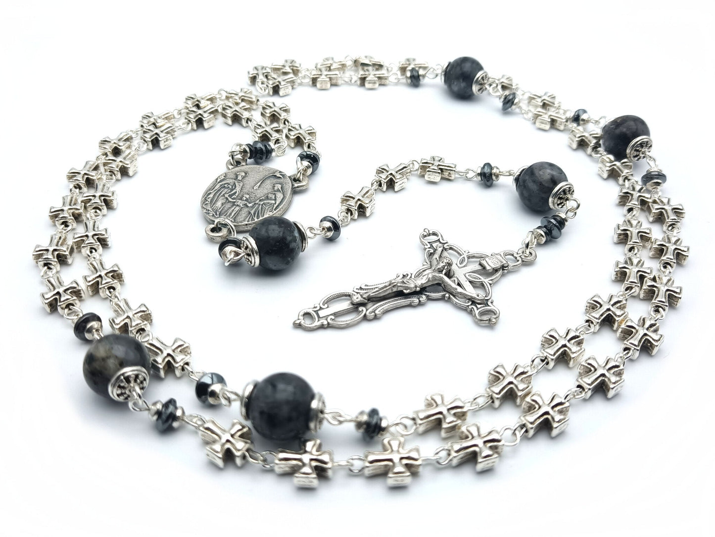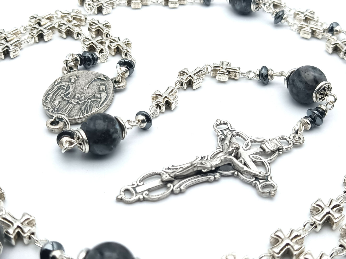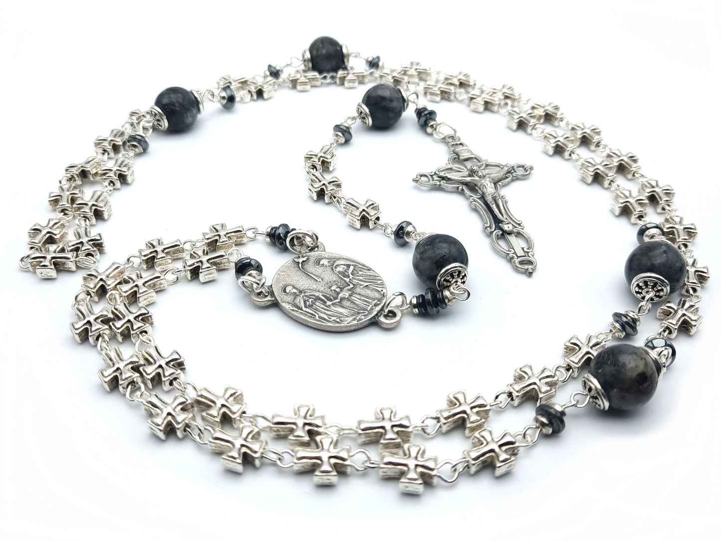 Three Hearts of Mary, Joseph and the child Jesus silver rosary beads with filigree crucifix and lavakite gemstone beads, handmade with high quality materials.