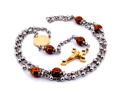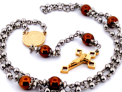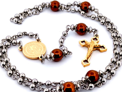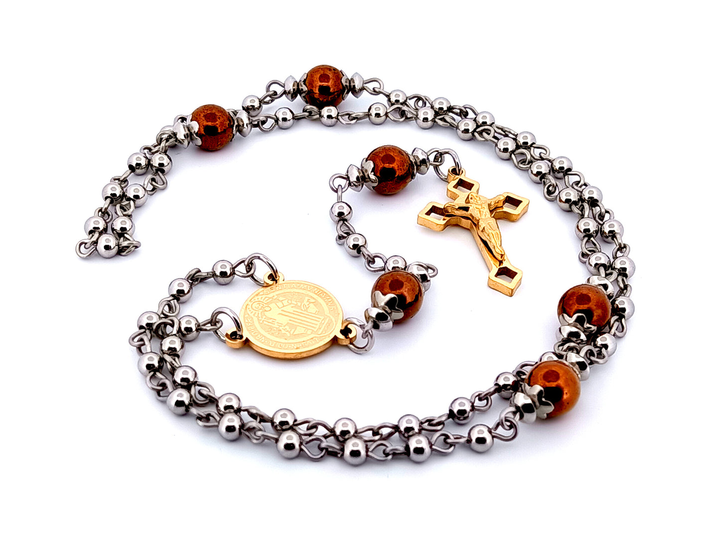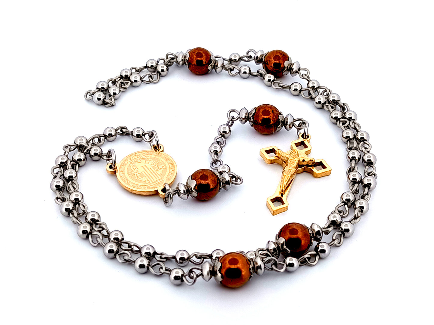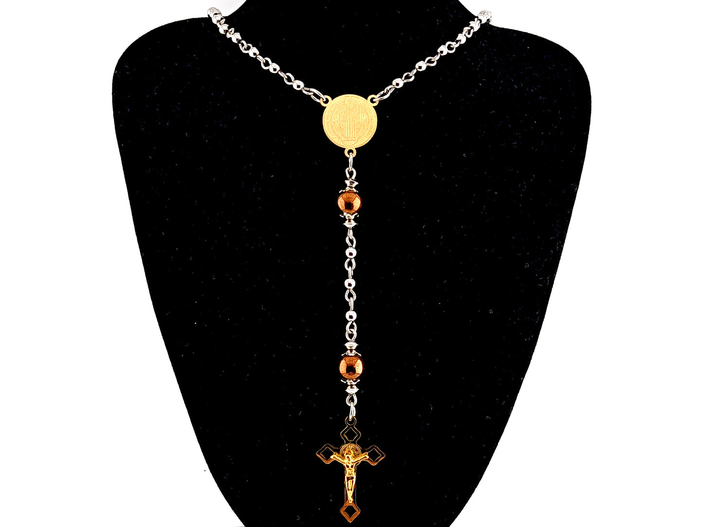 Saint Benedict gold plated stainless steel and gemstone wearable rosary bead necklace with sunburst crucifix.